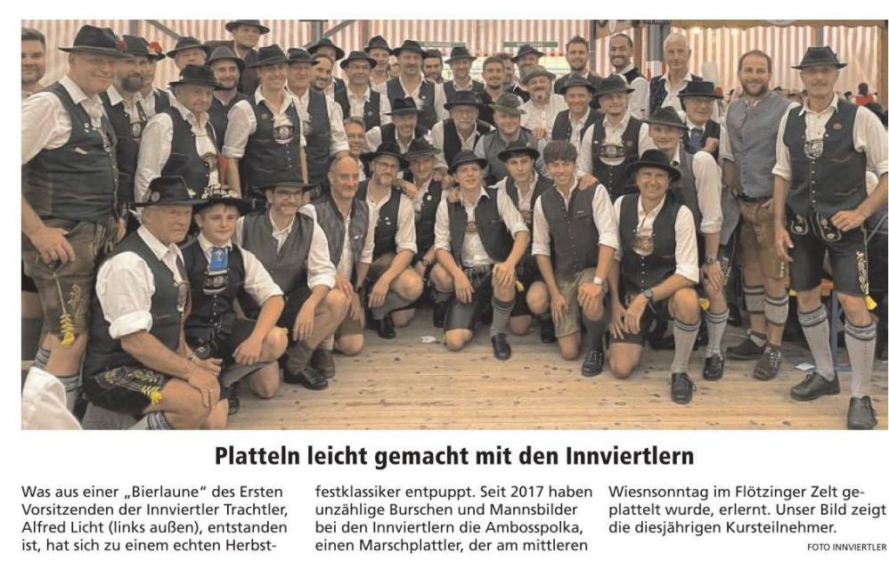 Auch in diesem Jahr hat der Trachtenverein "D' Innviertler" Rosenheim einen Kurs im Angebot, der die Teilnehmer befähigt, am Blasmusikabend während des Herbstfestes den "Massenplattler" in der Menge mitzuplatteln. Wegen der Absage der Rosenheimer Wiesn in diesem Jahr wird auch kein Blasmusikabend im Flötzinger-Zelt stattfinden. Kein Grund, jetzt untätig zu sein, sondern eine passende Gelegenheit die Krise zur Weiterbildung zu nutzen.