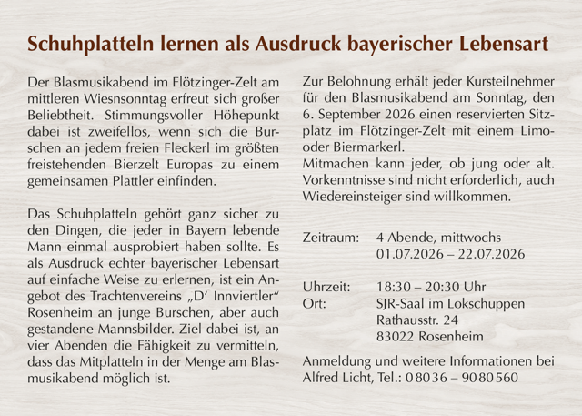 Auch 2026 wird es wieder unseren beliebten Plattlerkurs fürs Rosenheimer Herbstfest geben und Du kannst mit dabei sein. Im Juli 2026 starten wir wieder und freuen uns über Deine Voranmeldung.