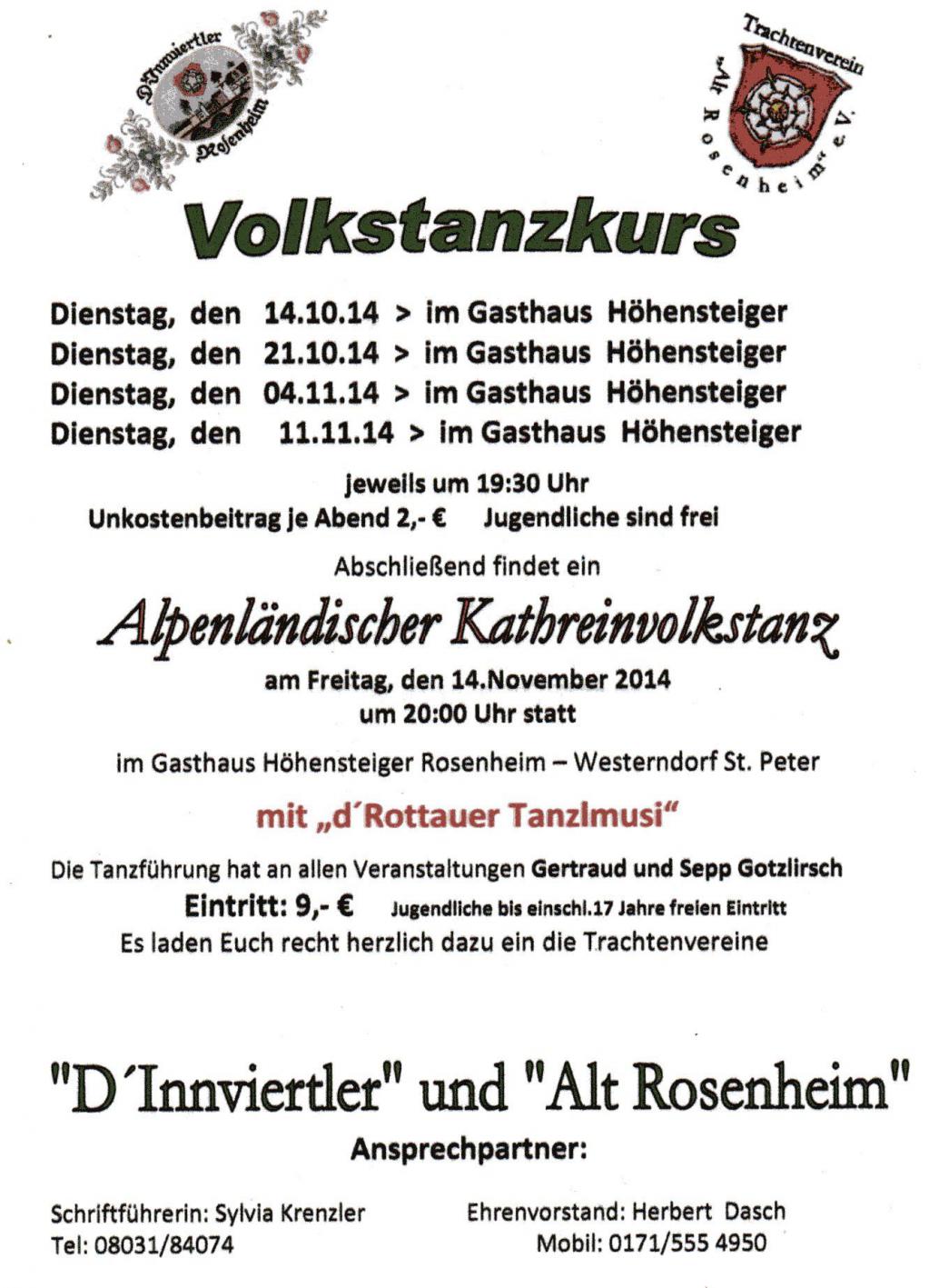 Auch in diesem Jahr erfreuten sich zahlreiche Kinder zwischen fünf und zehn Jahren am kostenlosen Angebot des Rosenheimer Trachtenvereins "Innviertler". Unter der geduldigen und gekonnten Anleitung von den Kursleitern Gertraud und Sepp Gotzlirsch lernten die Kinder spielerisch einfache Tänze und Lieder und bekamen so ganz nebenbei echten Brauchtumsunterricht. Dazwischen war Zeit für beliebte Spiele wie die "Reise nach Jerusalem" oder "Ochs am Berg", ehe man sich mit Limo und Kuchen stärken konnte. Zum Schluss blieb noch Zeit zum "Oarscheibn", einem traditionellen Spiel, das selbst nicht allen Eltern geläufig war. Einigen Teilnehmern hat es so gut gefallen, dass sie künftig aktiv bei der Kindergruppe mit dabei sein wollen. Darüber hinaus sind alle Kinder ab vier Jahren herzlich eingeladen, einmal unverbindlich bei den Proben mit dabei zu sein.